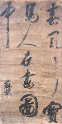 在中國書壇占有極重要地位的蘇軾,目前存世書法作品僅數(shù)十件,均藏于博物館,范圍也限于手卷、書帖、橫披等中小字形!啊洞猴L(fēng)》這件姍姍來遲的‘大手筆’,彌補了因缺乏大幅作品而導(dǎo)致的蘇派書法體系的不完整!毙靻⑿圩蛱煺f,“數(shù)月前,一位外地收藏者帶藏品來杭州找我鑒定真?zhèn)!毙靻⑿弁嘎,這幅僅存內(nèi)芯、名為《春風(fēng)》的中堂大軸草書高165厘米、寬65厘米,紙面發(fā)黃發(fā)暗,部分已腐化剝落,落款為“蘇軾”,另有“蘇軾”、“東坡居士”兩方隱約可辨的印章。上書“春風(fēng)寶馬人在畫圖中”,“春風(fēng)”后缺一字,其余每字高、寬在30-60厘米,最后的“中”字高62厘米。