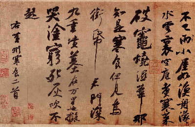 “蘇軾書作分早、中、晚三個時期:早年姿媚,中年圓勁,晚年豪放。就筆法看,《春風(fēng)》恣意揮發(fā),氣勢磅礴,飄逸豪放,當屬晚年作品!毙靻⑿叟袛啵洞猴L(fēng)》應(yīng)為蘇軾在“烏臺詩案”后被貶居惠州、海南,生活窘迫但仍受當?shù)厝藷崆榻哟螅栽娫~、書畫回贈所為,因此得以在民間保存。