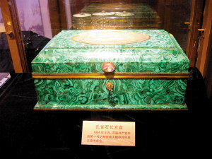 1954年9月,蘇聯(lián)共產(chǎn)黨中央第一書記赫魯曉夫贈送毛澤東的孔雀石首飾盒。