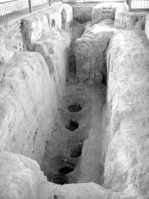 新鄭市博物館館長杜平安介紹說,長方形豎井底部南北長8.7米,東西寬2.5米,深2.24~3.35米,在地下室的東南角筑有一條斜長7.3米、寬0.58~0.7米,共有13級臺階的通道,傾斜度為50度!斑@種深入地下3米多,四壁又用夯土建筑,進入地下通道又窄又陡的建筑設(shè)計,是出于保持地下溫度低于地上溫度而考慮的。”