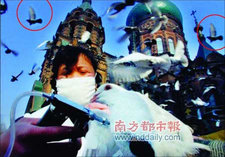 [提要] 現(xiàn)在是“大家來找碴”時間,06CCTV年度十大新聞圖片《藏羚羊生命中的十道難關(guān)——鐵路關(guān)》已被成功鑒定為假照片。今天推出的這張是2005年首屆華賽金獎作品《廣場鴿接種禽流感疫苗》。作者否認曾修改照片,但當年華賽評委蔣鐸認為兩只鴿子是PS無疑。接下來讓我們一起等待專家調(diào)查。