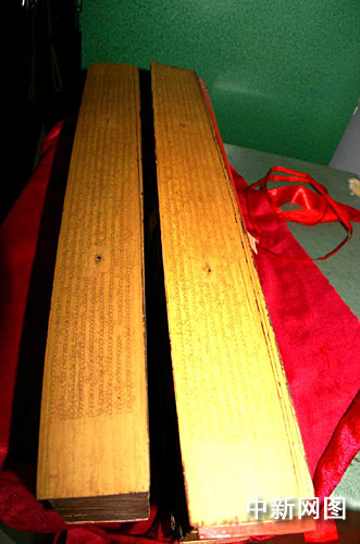 記者在贈(zèng)送儀式上看到,《貝葉經(jīng)》用紅綢布包得嚴(yán)嚴(yán)實(shí)實(shí)放在一個(gè)托盤上。儀式結(jié)束后,寶峰寺中主持輕輕打開(kāi)了紅綢布,經(jīng)書漸漸露了出來(lái)。經(jīng)書長(zhǎng)約四十厘米,寬、厚均有十多厘米。