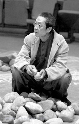 在演出現(xiàn)場記者看到,小劇場前排的座椅都已拆除,在舞臺下空出一塊正方形區(qū)域,幾百塊大小不一的鵝卵石堆放在演出區(qū)域內(nèi),1個多小時的演出就在這些石頭中進行。盲人演員手持盲杖小心地邁出每一步,有了這些石頭做定位標(biāo)志,他們走臺時不再那么茫然。因座椅被拆除,每次演出只能容納200名觀眾。