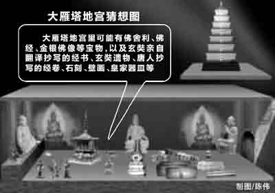 。兾鳎┦∩缈圃鹤诮萄芯克L王亞榮日前介紹,和法門寺寶塔下有地宮一樣,大雁塔下也藏有千年地宮。據(jù)推測,玄奘自印度取經(jīng)歸來后,所帶回的珍寶有很多藏在大雁塔下的地宮里。