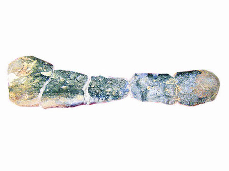 目前,已挖掘出土的化石有股骨、趾骨、和一些關(guān)節(jié)骨頭,已收集骨頭30多塊。還有部分骨化石包裹在巖石里面,株洲市文物局已運回兩車巖石,將對其進行切割、清理。考古人員將恐龍化石的趾骨、股骨拼湊起來,經(jīng)測量趾骨約20厘米,股骨長約77厘米,接近屁股段的股骨化石寬約22厘米,考古專家推測其腿部高在2米以上,據(jù)此可推斷是巨型恐龍。