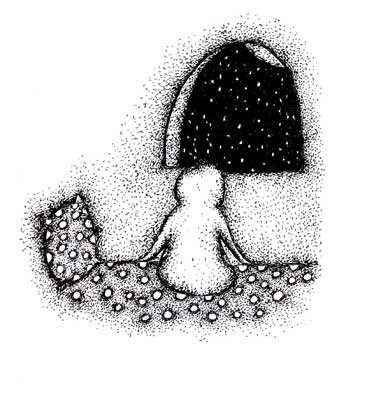 陳廣頤的黑白畫(huà)作,獨(dú)樹(shù)一幟,意境無(wú)窮,構(gòu)思奇巧,深邃深刻。最富有趣味的是她創(chuàng)造的書(shū)中小伊砣人物造型,堪稱一絕,一襲小袍子將全身包裹至嚴(yán),不設(shè)五官,但小人物神態(tài)、心態(tài)、情態(tài)和體態(tài)傳達(dá)得極其富有神韻,極其生動(dòng)鮮活,流淌著作者無(wú)盡的浪漫和憂愁的詩(shī)意,甚至每一個(gè)轉(zhuǎn)過(guò)身去的小背影都讓人心生愛(ài)憐和留下無(wú)盡回味想象。就是這個(gè)經(jīng)典而可愛(ài)的小人物形象緊緊牽動(dòng)著讀者的心,讓讀者和書(shū)中的小人物共同悲喜。雖掩藏包裹至深,但一個(gè)可愛(ài)浪漫、孤寂苦悶、追夢(mèng)奮斗的留學(xué)海外的小人物跳躍在紙上,讓人愛(ài)不釋手。