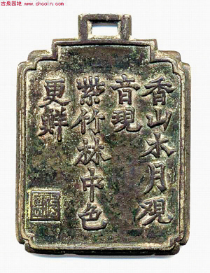 “香山水月觀音現(xiàn),紫竹林中色更鮮。”昨日,一塊刻有無名詩句的清代古銅牌現(xiàn)身渝北區(qū)。對(duì)此牌,收藏界有兩種說法。一說,此牌是“名妓號(hào)牌”;二說,是當(dāng)時(shí)某地下組織的“會(huì)員證”。