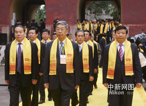 古磬敲響,身披黃色綬帶的朝圣者們莊嚴步入屬于先哲的歷史時空,在杏壇與大成殿間緩緩止步。抬首仰望,巍然聳立的孔廟大成殿正如至圣先師,于云霧之間俯視黎庶,巋然等待著后世眾人的朝拜!袄^往開來,永興此邦……”在山東省政協(xié)主席孫淑義的主持下,公祭大典開始。《天人合一》、《與時偕行》、《萬世師表》等樂章依次響徹孔廟,在身著明代祭服的舞者簇擁之下,中國全國人大常委會原副委員長許嘉璐、中國文化部副部長周和平、中共山東省委副書記、省長姜大明、聯(lián)合國教科文組織代表、孔子教育獎獲獎代表、著名書畫家范曾等朝圣者分別向先師孔子敬獻花籃。