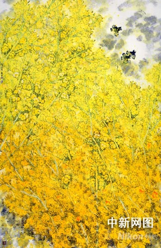 龐舜堯在油菜花系列組畫的創(chuàng)作上,與傳統(tǒng)意義上的寫意花鳥畫有著明顯不同。組畫以潑彩為主,富于抽象意味,作品以耀眼奪目的黃色寓意3月的萬物復蘇與生命活力的四溢,大面積的黃色,以深淺不同、明暗差別體現(xiàn)3月菜花遍地黃的詩意景象。在該套作品里,油菜花的具體性已經被剝離剩下的近乎成為抽象的意向感覺,明麗的黃色刺激著視覺,讓人興奮。