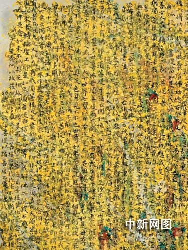這種表現(xiàn)手法,還體現(xiàn)在文字系列的組畫上。龐舜堯是中國書法家協(xié)會會員,長年抄寫佛經,書法舒朗雋秀,富有禪意。該組繪畫由細小的《金剛經》文字組成,將文字作為畫面的肌理,遠觀是現(xiàn)代風格的抽象畫,近看則是由細小的佛經文字組成。據(jù)龐舜堯介紹,最大的一副作品,由3萬個工楷寫滿,整個創(chuàng)作持續(xù)了將近一年多的時間。