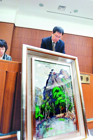 “快看,肯定是那幅畫!鄙衔9時(shí),在旁聽人群的一陣騷動(dòng)聲中,用塑料薄膜包裹著的大方框被抬進(jìn)一中院的法庭。金茂律師事務(wù)所的王建軼律師打開包裝,一幅油畫展現(xiàn)在眾人面前!斑@是幅假畫。”王建軼律師說,他的委托人蘇敏羅以230萬元的價(jià)格從北京翰海拍賣有限公司拍得這幅畫,而此畫當(dāng)時(shí)被介紹為吳冠中的作品。