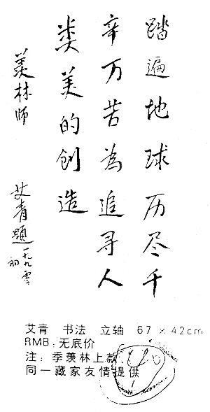 昨日,艾青妻子看到“金兆拍賣圖錄”復(fù)印件中艾青的書法作品后告訴本報,這幅作品可以百分之百肯定為假的,“從哪方面來說都是假的,艾青和季羨林沒什么交往,從字跡來說是假的,從年代上來說也不可能!