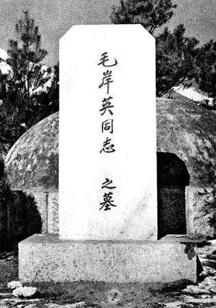 在朝鮮平安南道檜倉郡的“中國人民志愿軍烈士陵園”內(nèi),一塊一米高的花崗巖石矗立在墓前,正面刻著“毛岸英烈士之墓”;背面刻著:“毛岸英同志原籍湖南省湘潭縣韶山?jīng)_,是中國人民領袖毛澤東同志的長子。1950年11月25日在抗美援朝戰(zhàn)爭中英勇犧牲。毛岸英同志的愛國主義和國際主義精神將永遠教育和鼓舞著青年一代。毛岸英烈士永垂不朽!”