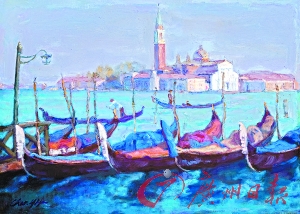 而陳逸飛的《威尼斯》以前從沒(méi)有拍賣(mài)過(guò),是現(xiàn)在的擁有人1999年直接向畫(huà)家購(gòu)買(mǎi)的。取景是威尼斯著名的大運(yùn)河 ,前面泊著4艘運(yùn)河木船 ,運(yùn)河上另有兩艘木船,對(duì)岸是著名的圣馬可大教堂。朦朧的煙霞,叫人分不清是早晨還是黃昏。采用的意象表達(dá)手法是陳逸飛作品中極為罕有的。早在1990年,畫(huà)家曾繪過(guò)一幅同名的風(fēng)景畫(huà)。然而兩幅畫(huà)有很大的不同。1990年那一幅層次較分明,色彩也較濃烈,采用的是陳逸飛一貫的寫(xiě)實(shí)手法。9年后的《威尼斯》用色較淡,景物的處理較隨意,很有印象派大師莫奈的影子。