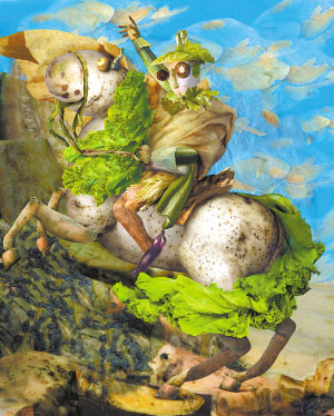桔多淇在產(chǎn)生蔬菜作畫的想法后,就開始轉(zhuǎn)悠北京的菜市場(chǎng)。她去買菜,看到長(zhǎng)相怪異的生姜,眼里就會(huì)大放異光,迅速下手,而走到賣豆腐的面前,也不說話,拿出相機(jī)就對(duì)著白花花的豆腐開拍。桔多淇說:“菜販以為是媒體搞衛(wèi)生監(jiān)督,嚇得不行,其實(shí)只是因?yàn)槲易觥蹲詈蟮耐聿汀返淖雷有枰艽笠粔K豆腐,我買回家也吃不完,于是就在菜市場(chǎng)拍了回家用電腦處理合成!苯鄱噤空f,她尋找原料的菜市場(chǎng)幾乎每一個(gè)菜攤她都“光顧”過,并且對(duì)菜市場(chǎng)邊角余料情有獨(dú)鐘,甚至還會(huì)四處“撿”菜。