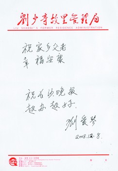 今年11月24日是劉少奇誕辰110周年,此次來參加紀(jì)念活動(dòng)以及昨日追憶活動(dòng)的劉愛琴是近五年來第一次回家鄉(xiāng)!凹亦l(xiāng)變化很大,發(fā)展也很好,如果父親看到這些變化,相信也會(huì)感到很欣慰的。”劉愛琴說。對(duì)家鄉(xiāng)父老,劉愛琴深深牽掛。昨日在劉少奇紀(jì)念館,劉愛琴專門托本報(bào)向家鄉(xiāng)父老問好,書寫了“祝家鄉(xiāng)父老幸福安康”,同時(shí)寄語(yǔ)本報(bào):“祝長(zhǎng)沙晚報(bào)越辦越好”。