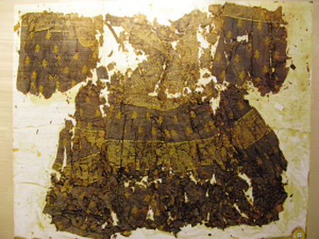 “2006年,我們赴定陵進行復制前的考察,在嚴密的文物庫房里,看見當年出土的這件龍袍,平放在一層層的柜子里,由于庫房需要防腐、防霉、防潮等原因,里面放了各種藥劑,所以味道很大,我們幾個人只好輪流進去!痹棋\所張玉英副所長對記者說。這件龍袍在地下埋藏了300年,已經腐朽不堪,只好根據當年的發(fā)掘報告進行研究。據資料記載,1958年出土時,龍袍部分仍然有色彩,紋飾還閃閃發(fā)光,但至今也有半個世紀了,龍袍原件早已褪色、局部化成碎片。“這就是我們拍攝的龍袍原件照片。”張玉英指著照片告訴記者。只見照片上的龍袍已經變成一堆咖啡色的碎片,看不出衣服上的龍紋,唯一奪目的就只有金線織成的“壽”字。復制專家們查找了大量古籍文獻資料并研讀考古報告,經過多次論證,最后終于拿出了復制方案。