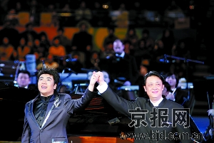 由于擴(kuò)音效果很好,演奏的也投入,郎朗反而覺得北京觀眾很安靜。對(duì)于一些觀眾無法投入欣賞的抱怨,郎朗也非常理解,“畢竟體育館不能和音樂廳的環(huán)境相比,而且這次的協(xié)奏曲比較多,我就是想試一下,在體育館里不用雜耍普及古典音樂能不能做到!北M管昨晚現(xiàn)場的氣氛還是在《彩云追月》、《翻身的日子》這樣短小精悍的返場曲后達(dá)到高潮,但郎朗認(rèn)為,最終能留在人心里的還是《肖邦第一鋼琴曲》這樣的作品。