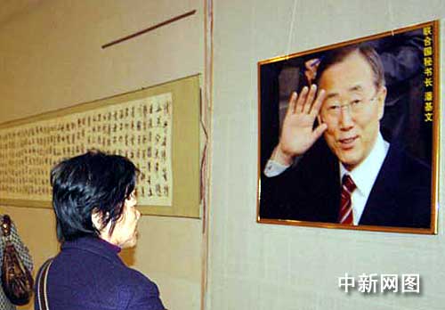 中新網(wǎng)南寧1月11日電(記者 劉萬強(qiáng))聯(lián)合國秘書長潘基文“亮相”中國廣西博物館正在舉行的2009年潘氏迎春書畫藝術(shù)作品展上,在該項(xiàng)展覽中,潘基文作為潘氏名人,他的兩幅照片被掛在展廳內(nèi)的顯著位置。