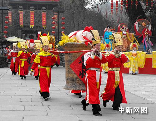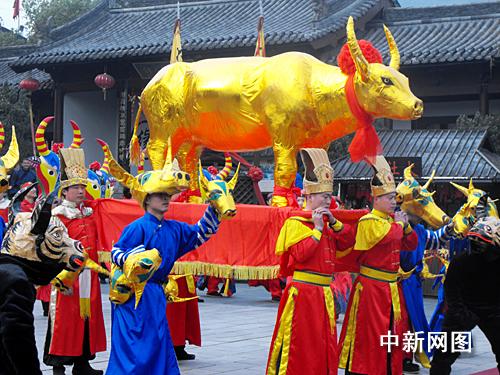 在杭州宋城景區(qū),記者看到,俏皮可愛的芒神手執(zhí)神鞭向一頭碩大的金牛揮去。每抽出一鞭,便引來圍攻群眾歡呼雷動。身穿九龍絳紗袍的大宋皇帝手執(zhí)高香,引領(lǐng)文武百官、后宮嬪妃登壇祭拜,一步一停,口中念念有詞;繼而,臺下上百位演員裝扮各路神仙載歌載舞,鞭炮鼓樂響徹云霄……這便是2009年杭州宋城景區(qū)的主打民俗演出“鞭打春!钡膲延^場景。