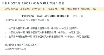 網(wǎng)友在《北川政府110萬(wàn)采購(gòu)豪華越野車(chē)》的帖子中,展示了一張名為“北川采購(gòu)工作用車(chē)中標(biāo)公告”的截圖,而韓寒在其博客里引用“來(lái)自綿陽(yáng)政府采購(gòu)網(wǎng)”的資料,列舉綿陽(yáng)購(gòu)買(mǎi)的10萬(wàn)余輛車(chē)一覽,所有越野車(chē)的價(jià)格都在10萬(wàn)到100萬(wàn)之間。其中有長(zhǎng)豐獵豹、東風(fēng)日產(chǎn)奇駿、豐田普拉多等10萬(wàn)以上的越野車(chē),價(jià)格在50萬(wàn)以上的車(chē)就有4輛,其中就有豐田普拉多VX4.0導(dǎo)航版,價(jià)格62.60萬(wàn)元。另外還不乏像蘭德酷路澤頂配這樣的百萬(wàn)豪車(chē),所有車(chē)的總價(jià)值超過(guò)400萬(wàn)。