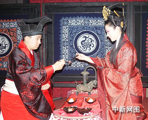 中新網(wǎng)2月2日電 春節(jié)期間,一對山東濟南新人專程來京,舉辦了一場莊嚴神圣的周制婚禮。與以往婚禮不同處在于,此次婚禮并未邀請賓客,且全場參禮者均著漢服,故而由醮子、催妝、送親、合巹、拜父母恩等環(huán)節(jié)組成的整場儀程就顯得尤為高貴典雅、神圣肅穆,傳統(tǒng)漢婚文化被演繹成類似情景劇的形式,漢“昏禮”元素被彰顯的淋漓盡致。
