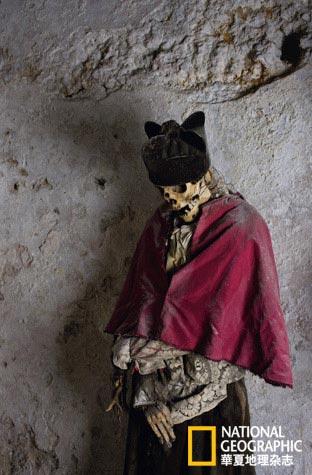 美麗小鎮(zhèn)諾瓦拉有一座規(guī)模宏大、富麗堂皇的教堂。祭壇前方有一扇通向地下密室的暗門(mén),只需撳動(dòng)一個(gè)隱藏的按鈕,電控開(kāi)關(guān)就會(huì)把門(mén)打開(kāi),如同007電影中的情景。下了臺(tái)階就能看到一列壁龕,存放著衰敗程度各不相同的主教尸體。他們坐著鑿了些圓孔的小石椅(供體液滲流),面容僵直,像是在一起享受公廁里的放松時(shí)刻。一座擺滿了頭骨的高架子上有個(gè)盒子,里面裝著兩具自然干化的貓尸,恍若古埃及的魅影。它們困在這地下墓室里,提醒著人們:即使真有九條命,歸宿也只有一種。 (來(lái)源:《華夏地理》雜志 )