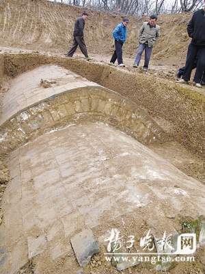 昨天下午,記者來到位于雨花臺(tái)區(qū)鐵心橋附近一個(gè)叫馬家店的村落,這里正在進(jìn)行京滬高鐵的勘探施工。幾名工人告訴記者,他們負(fù)責(zé)在此日夜看護(hù)古墓,“因?yàn)楣拍贡话l(fā)現(xiàn)時(shí),墓門已經(jīng)被聞風(fēng)而來的盜墓賊破壞了,東面的一座古墓發(fā)現(xiàn)有人進(jìn)去過的痕跡!庇浾吲郎衔髅娴囊蛔拍,只見考古人員已經(jīng)挖出古墓的地表范圍,大部分墓頂已經(jīng)露出土層?脊湃藛T說,這座古墓比較大,外形保存基本完好,長約有8米,寬約3.5米,近幾日就準(zhǔn)備打開墓門!庇浾呖匆娔故业娜斏嫌幸欢芽此票粍(dòng)過的亂磚,大約80厘米見方,考古人員介紹說,應(yīng)當(dāng)是過去盜墓賊留下的“杰作”。