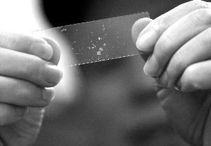 在辦公室中,潘彪教授小心翼翼地取出一個紙盒子,盒子上有“木材樹種取樣標本”的字樣。打開盒子,掀開一層棉花,幾塊玻片整齊地疊放在一起。湊近了看,記者才發(fā)現(xiàn)里面只有星星點點般的木屑,袖珍得可憐!斑@就是取回來的樣品?”記者有些失望!笆前,就這些還花了幾個鐘頭才找到的呢!迸吮肽缶o兩片玻片,囑咐記者憋住呼吸,別把這些木屑吹散了!澳阒灰豢跉,就能把這些寶貝吹走!
