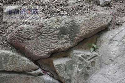 記者在九曲山瑞跡寺后的山崖找到了讀者所說的神秘巖畫。這是一處幾近垂直的巖壁,壁上人工雕刻的痕跡已被風雨侵蝕得有些模糊,有兩處圖案相對清晰,一處的圖案如孔雀開屏,一條條直線呈放射狀散開。另一處則由幾塊巖畫組成,最上方一塊半米多高、一米多寬的石塊上,刻著一朵朵云狀花紋。下面則刻著一個幾何圖,像是一個舉起雙手的人,周圍有好幾個圈。