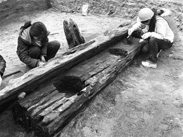 昨(3)日,在現(xiàn)場負責發(fā)掘的考古人員張擎帶領下,記者進入了考古現(xiàn)場,映入記者眼簾的是一些橫木和柱子。保存較為完整的一根柱礎底板長3.4米、寬0.45米、厚0.3米,其上有4個圓形柱洞,最高的一根立柱,高1.4米、最大直徑0.3米。這都是些什么呢?“這可是本次發(fā)掘的最大發(fā)現(xiàn),超長的豪華漢代廊橋!”張擎激動地說,“從木橋的結構和古河道內(nèi)出土的遺物推測,這座木橋是漢代典型的建筑,結構與2001年在金沙遺址蘭苑地點發(fā)現(xiàn)的漢代木橋完全相同,民間又叫它‘風雨橋’。”