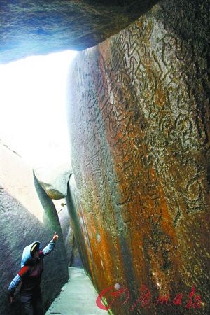 我們沿山路攀爬港灣旁邊的風(fēng)猛鷹山,不久便到達(dá)其中最大一幅巖畫(huà)所在地:藏寶洞。從遠(yuǎn)處看,這只是一堆巨大的花崗石巖體,若從空中俯視,可以發(fā)現(xiàn)它像一只碩大的海蚌,微微張開(kāi)一條縫,而巖畫(huà)就刻在這花崗石崩裂兩瓣后的平整的巖面上(見(jiàn)主圖)。