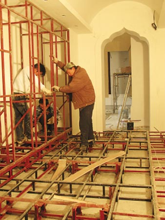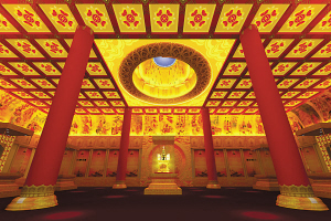 走進(jìn)展覽大廳,正中間就是出土于南京大報(bào)恩寺遺址名揚(yáng)四海的七寶鎏金阿育王塔的主展區(qū),設(shè)計(jì)師用“天圓地方”來形容他對(duì)核心之處的設(shè)計(jì)理念。崇圣殿的大廳內(nèi)從地面到屋頂估計(jì)有9米高,記者看見施工單位搭起了3層高的腳手架,幾名工人正在為圓頂上色,“圓頂共制作了三圈,最大的一圈直徑2.4米,一圈比一圈縮小,這樣可以體現(xiàn)出一種神秘的層次感。18幅飛天壁畫盤旋在圓頂周邊,最高一圈內(nèi)畫上藍(lán)色的夜空,然后安裝LD最新燈光系統(tǒng),16盞射燈對(duì)應(yīng)的地方是方形的仿漢白玉基座,座上四邊是進(jìn)口的鋼制廊桿!庇浾咦铌P(guān)心的是基座上究竟陳列什么文物?無疑是大家都想要看到的,美麗無比的七寶鎏金阿育王塔。
