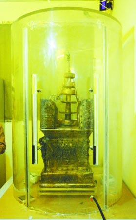 本月28日,“長干寺地宮出土文物展”將在南京市博物館盛大開幕,被譽(yù)為“驚世大發(fā)現(xiàn)”的阿育王塔(如圖,崔曉攝)也將首次公開亮相。除了“塔王”,市民在這次展覽中或許還會收獲意外的驚喜。記者昨日獲悉,南京市博物館的考古專家近期可能會從阿育王塔中請出金棺銀槨。不出意外,這件裝有佛頂真骨、諸圣舍利、感應(yīng)舍利的“圣物”,也將和長干寺地宮出土的其他文物一起出現(xiàn)在展覽現(xiàn)場。
