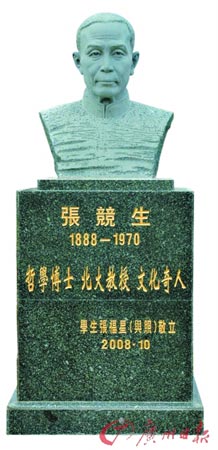 張競(jìng)生故居的建筑已翻新,周圍平整一新不復(fù)當(dāng)年的景象。一間居室門口的水井旁,新立了一座故居主人的雕像,底座上刻著寥寥數(shù)語(yǔ)“哲學(xué)博士 北大教授 文化奇人”。
