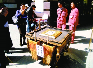 昨天中午,記者看到一只編號(hào)為0350的奧運(yùn)缶擺在該小區(qū)門(mén)前,其四周用鎖鏈與地面連接,缶上貼著“貴重物品,請(qǐng)勿觸摸”的紙條。旁邊坐著兩名自稱(chēng)是中國(guó)金銀幣禮品網(wǎng)員工的女孩。據(jù)她們介紹,所賣(mài)的缶都是奧運(yùn)會(huì)開(kāi)幕式上用過(guò)的,完好無(wú)損,均由單位以每個(gè)10萬(wàn)元左右的價(jià)格從官方拍得,除部分?jǐn)[在分公司展示外,剩下六七只準(zhǔn)備售賣(mài),現(xiàn)在明碼標(biāo)價(jià)賣(mài)12.8萬(wàn)!懊恐惑径加惺詹刈C書(shū)和電子身份證書(shū),可以上網(wǎng)核查真?zhèn)。擺在這里的是供展示,如果市民有興趣,可以留下手機(jī)號(hào)。”賣(mài)缶人員說(shuō)。