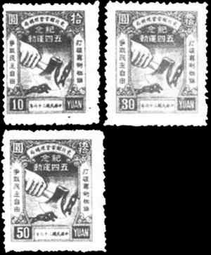 1947年5月4日,解放區(qū)東北郵電管理局發(fā)行紀(jì)念五四運(yùn)動(dòng)郵票1套3枚,分綠、淡棕、紫色三色,面值分別為10元、30元、50元。主圖為一支巨手持斧砍斷象征專制統(tǒng)治的鎖鏈,兩側(cè)空白邊框內(nèi)為兩條標(biāo)語(yǔ):“打破專制枷鎖”,“爭(zhēng)取民主自由”。這套郵票的設(shè)計(jì)者是張修平,他曾參考俄國(guó)十月革命后發(fā)行的郵票圖案,巨手握著寶劍砍斷鎖鏈,象征無(wú)產(chǎn)階級(jí)革命沖毀資本主義枷鎖。
