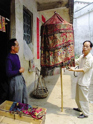 記者見到,兩頂官傘里襯均是純麻布,外層分別用白、紅、黃三種優(yōu)質綢布縫制而成,外表繡有獅子、龍、鳳和牡丹花等物;傘撐開時,高約1.2米,直徑0.8米。
