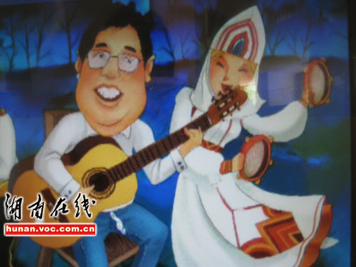 卡通片中,張家界市市長(zhǎng)趙小明以卡通形象出現(xiàn),手拿吉他載歌載舞,旁邊還有一行文字標(biāo)明:“張家界市市長(zhǎng)趙小明”。