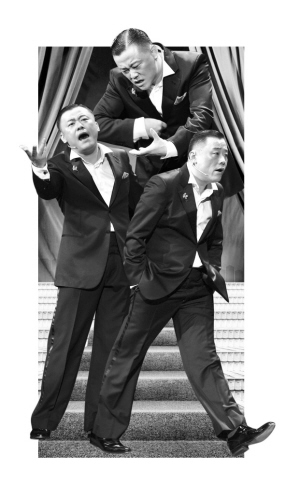 在周立波的《笑侃大上!分,最能引起臺(tái)下中年觀眾共鳴的就屬“文革”片段,錢文忠分析它之所以能產(chǎn)生如此強(qiáng)烈的“笑果”,除了勾起這一輩人的獨(dú)特記憶外,“他將‘文化大革命’說(shuō)成‘文化革大命’,其實(shí)是很睿智地指出了文革中種種荒唐可笑的現(xiàn)象!倍芰⒉ㄒ愿阈ι踔磷猿暗姆绞綘砍隽宋母锏倪@段記憶,也在無(wú)形中解開(kāi)了一個(gè)民族的心結(jié)。