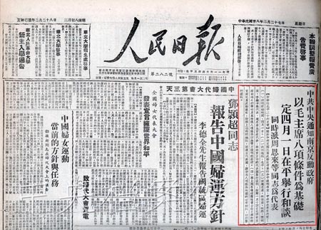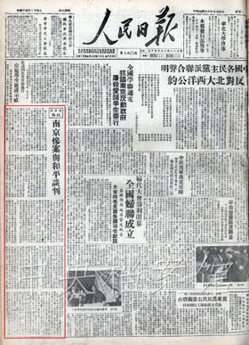 4月1日,由張治中、邵力子、黃紹竑、章士釗、李蒸、劉斐組成的南京國(guó)民黨政府談判代表團(tuán)到達(dá)北平,周恩來等設(shè)宴招待。以周恩來為首席代表,林伯渠、林彪、葉劍英、李維漢、聶榮臻為成員的中共代表團(tuán),開始與國(guó)民黨代表團(tuán)舉行和平談判。4月15日,形成八條二十四款的《國(guó)內(nèi)和平協(xié)定》。但結(jié)果,南京政府拒絕接受協(xié)定,徹底暴露了假和平的真面目。