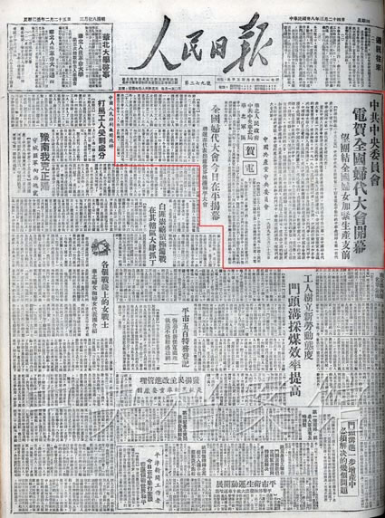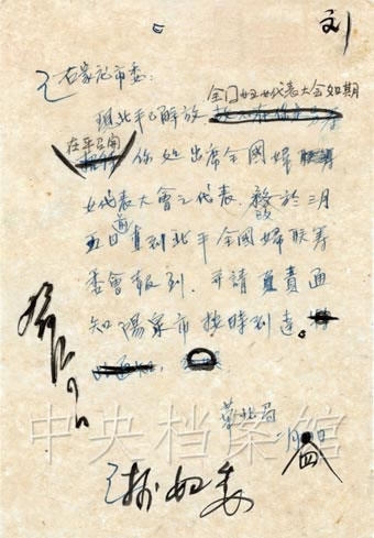 1949年3月24日——4月3日,第一次全國婦女代表大會在北平召開。毛澤東接見了全體代表,并為大會題詞:“為增加生產(chǎn),為爭取民主權(quán)利而斗爭!敝泄仓醒胫码娮YR。