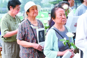 一個(gè)月前央視播音員羅京也是在這里與人們告別,和當(dāng)時(shí)的喧鬧相比,山尊老師的追悼會簡單安靜,前來悼念的大約有三四百人,簽到臺上厚厚的兩摞訃告和生平簡介只發(fā)出去了一半左右。悼念的隊(duì)伍里主要都是白發(fā)老人,很少能看見年輕人,這些人都是歐陽山尊藝術(shù)界的老朋友。曾與他一起在人藝共事的金雅琴回憶說,山尊熱情直爽、平易近人,可是在工作上誰要做不好,他的脾氣就大。歐陽山尊在中戲任教時(shí)惟一帶過的班級,59級導(dǎo)演專業(yè)的學(xué)生、著名導(dǎo)演曹其敬、白世本也來送恩師最后一程。