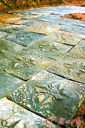 東回廊地面是兩種不同的地臺(tái)磚,上層磚呈長(zhǎng)方形,規(guī)格為20厘米×30厘米,底下一層呈正方形,每個(gè)邊長(zhǎng)40厘米。專家分析,上下不同規(guī)格的地臺(tái)磚,說(shuō)明南漢王朝統(tǒng)治的55年期間回廊地面也經(jīng)過(guò)了幾次修整。