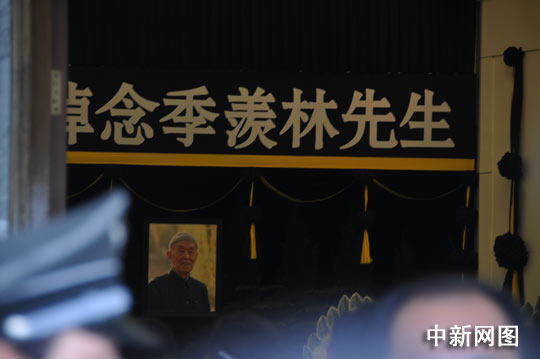 中新網7月19日電(張中江) 著名國學大師季羨林先生的遺體告別儀式19日上午在北京八寶山革命公墓東禮堂舉行。靈堂的上方懸掛著黑底白字的橫幅“沉痛悼念季羨林同志”,橫幅下方是頭戴絨帽、身穿藍色中山裝的季老遺像。