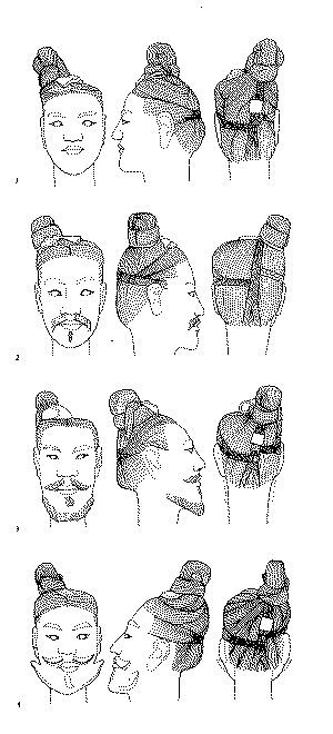 兵馬俑一向被視為秦始皇的士兵,但與一般戰(zhàn)場上的士兵不同,他們不僅沒有戴頭盔,而且梳著奇怪的“歪髻、偏髻”,頭發(fā)盤出多種多樣的花式,最后發(fā)髻歪在一旁(見右圖)。對此,一般學者認為,兵馬俑發(fā)髻偏右,可能與秦人尚右,以右為上的觀念有關。甚至還有專家認為陶俑頭上梳著偏于一側的發(fā)髻,是出于雕塑藝術造型的需要,是古代秦人俏皮性格的一種再現(xiàn)。但陳景元認為這些解釋都有些蒼白。他說,兵馬俑的藝術是以寫實為主的,因此這種偏右的“歪髻”在當時應有一定的生活基礎。在其他一些楚墓中,也出土過頭上梳著“偏髻”的泥俑。問題是秦朝的士兵,是否會如此裝扮自己?陳景元說,如果將俑坑里武士俑頭上的發(fā)髻和發(fā)辮散開,這一頭的長發(fā),至少也有0.6米長。軍營里的士兵,要將自己頭發(fā)精心編成發(fā)辮,盤出各種花式的發(fā)髻,是需要花費很長時間的,而且在水源不豐富的西北地區(qū),成千上萬的大軍要洗一次長頭發(fā)更是一種很不容易的事。