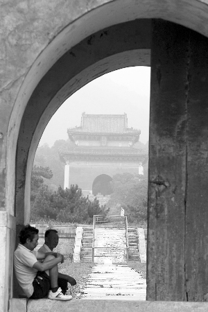 相比定陵的任你看個夠,永陵卻是神秘又神秘。在得到李德仲的允許后,司機驅(qū)車帶記者來到永陵。斑駁的路面,全是大城磚鋪砌,朱紅色的墻顏色已經(jīng)陳舊,木頭大門已見破損。攝影記者剛要踏進大門,一位師傅就板著臉喝止。他倚坐在門檻上,一臉威嚴(yán):“不能進,里面有探頭!”記者便乘機和他聊了起來,他姓齊,是新一代的守陵人。從上世紀(jì)80年代開始,他就擔(dān)任守護永陵一職,每天的生活非常簡單,睜開眼睛就是守在永陵的門口,偶爾聽聽收音機。齊師傅通常都是坐在永陵入口的青石門檻上,手里一個對講機。偶爾對講機會響起聲音,那是十三陵管理委員會通知他,有專家要來參觀了,做好接待準(zhǔn)備……不過,相比定陵和長陵,來這里參觀的人實在少之又少;大多數(shù)時間,老齊都是兩眼看著紅色斑駁的大門,還有門檻、破碎不一的城磚鋪砌的路面。