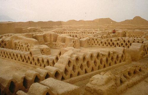 昌昌古跡位于太平洋海岸,是奇穆文明(Chimúcivilization)的首都。奇穆文明大約始于公元850年,消亡于1470年。土城城區(qū)是帝國(guó)的權(quán)力中心,帝國(guó)從厄瓜多爾南部延伸到秘魯中部,綿延1000多公里。15世紀(jì)時(shí)城市的居民達(dá)6萬(wàn)人,大部分是工人,服務(wù)于極權(quán)君主,還有高級(jí)手藝人和神父。那是個(gè)嚴(yán)格的世襲等級(jí)社會(huì):奇穆神話說(shuō),太陽(yáng)用三個(gè)蛋創(chuàng)造了人類,金蛋孵出了統(tǒng)治者,銀蛋孵出了統(tǒng)治者的妻子,銅蛋孵出的是大眾。