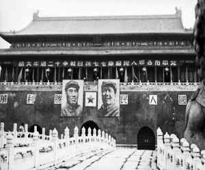 毛主席在天安門城樓上,領(lǐng)著與會者高呼:“中國人民萬歲!”“全國人民團結(jié)起來!”“打倒帝國主義!”“建立新中國!”“全世界人民團結(jié)起來!”“打倒帝國主義的走狗中國反動派!”“召開新的政治協(xié)商會議,成立民主聯(lián)合政府!”“爭取全世界的和平、民主!”