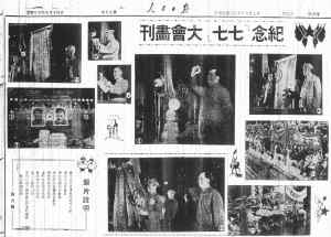這天,北京20萬各界群眾冒雨在天安門前舉行紀念抗戰(zhàn)12周年及新政協(xié)籌備會召開的盛大慶祝會。天安門城樓上懸掛著7盞大紅宮燈,飄揚著20面鮮艷的紅旗。城樓中央懸掛著毛澤東與朱德的巨幅畫像。兩位偉人畫像之間,掛著一顆巨大的紅星,光彩閃爍。當天下午,大會首先鳴49響禮炮以紀念“七七”抗戰(zhàn),隨后演奏《義勇軍進行曲》。